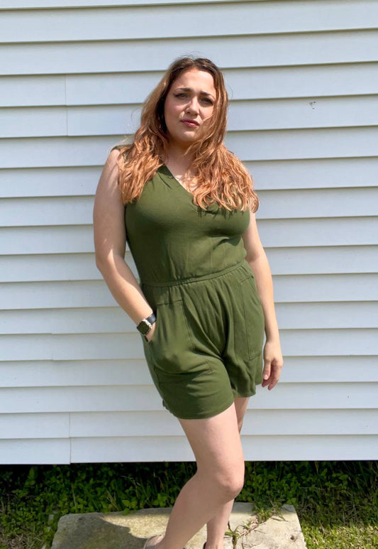 Short Sleeve V-Neck Romper in Army Green