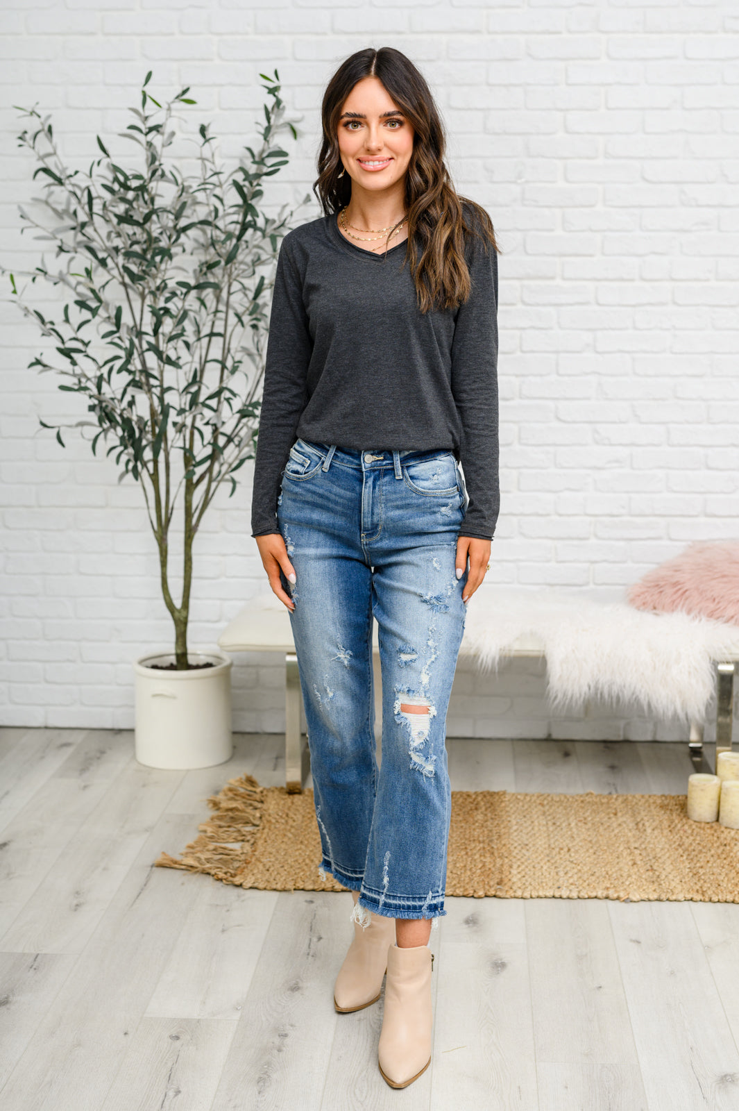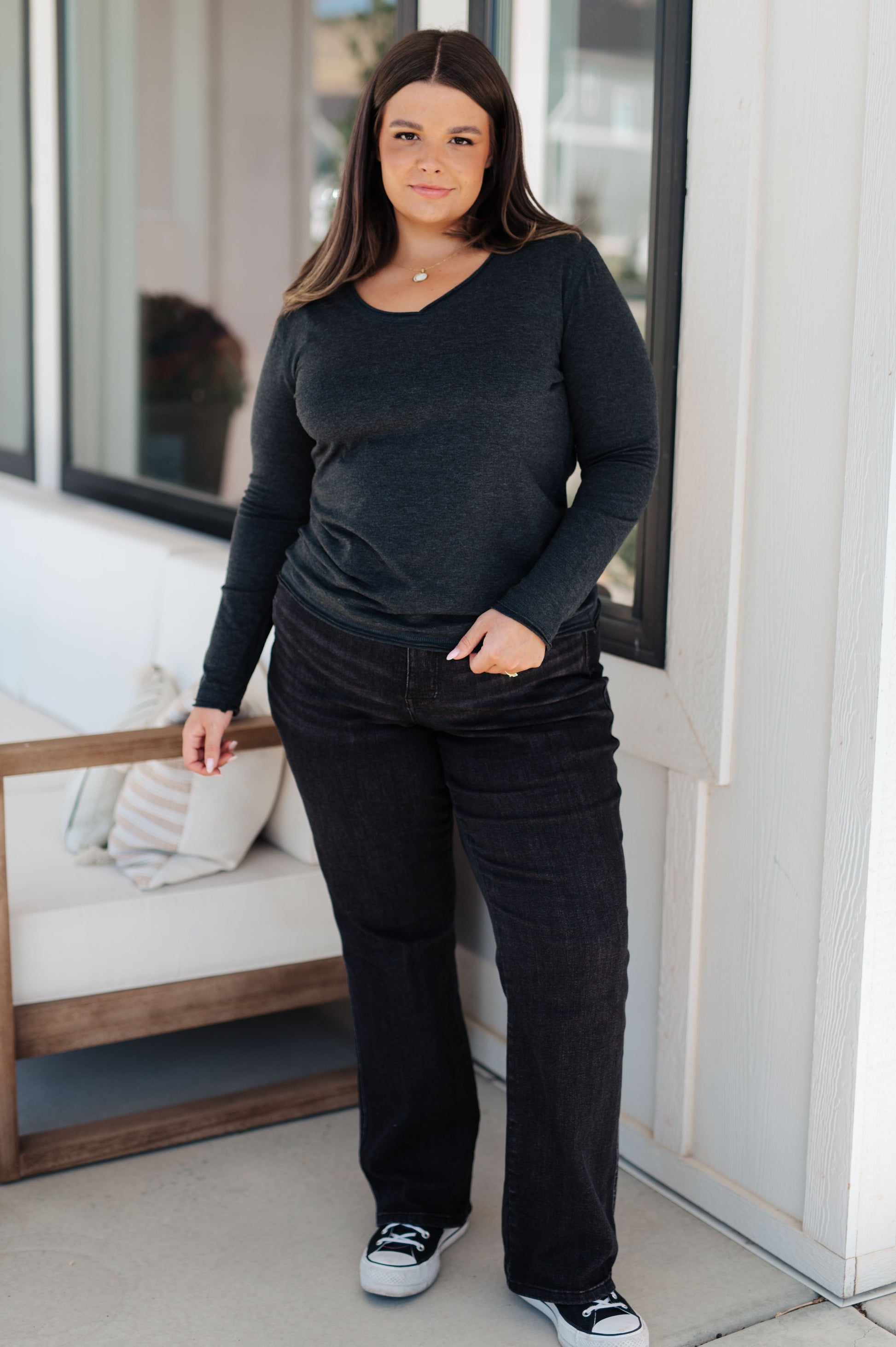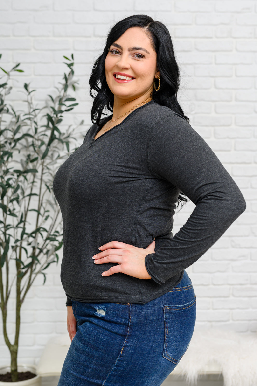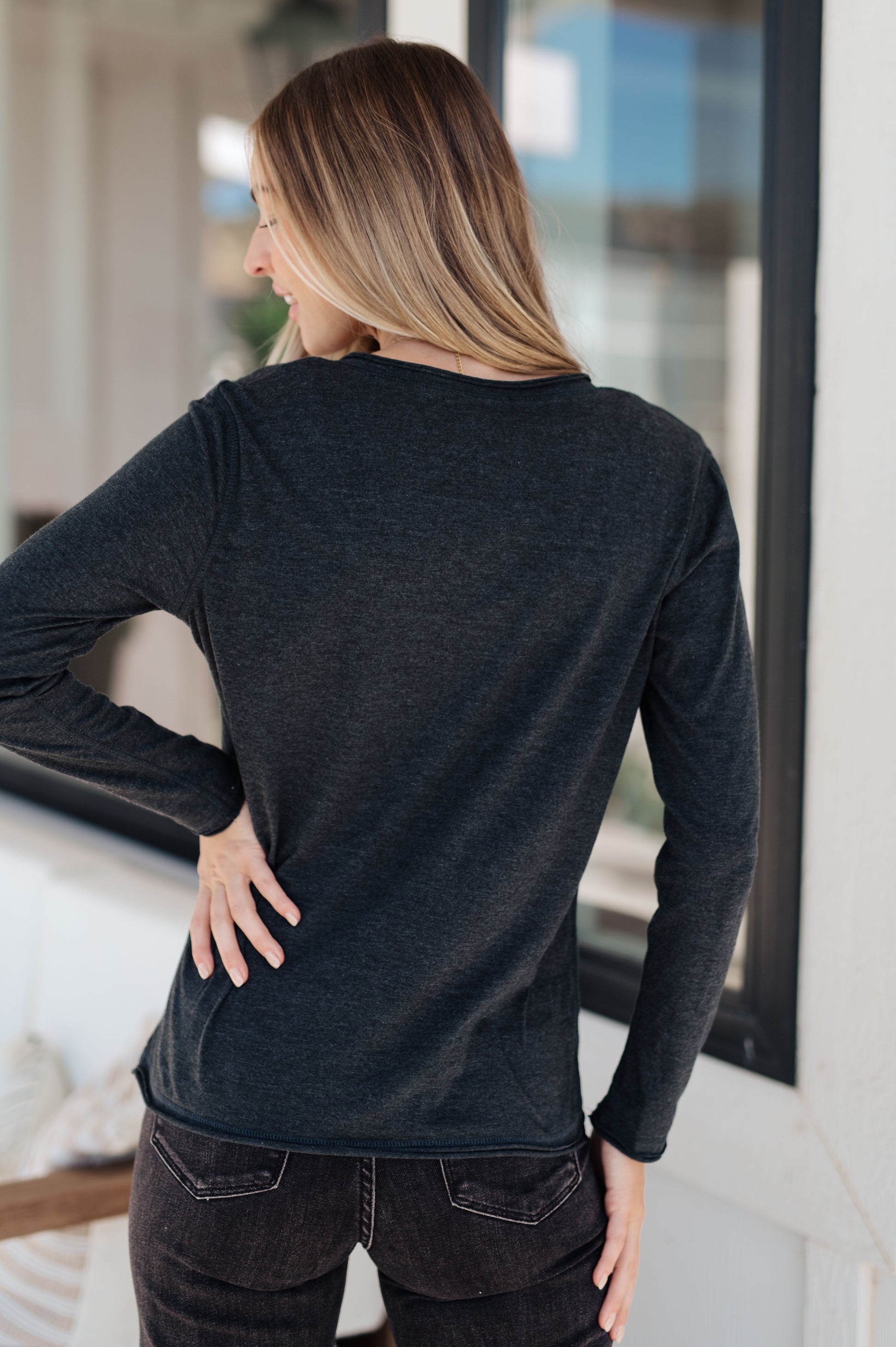 When you have a closet full of pieces like the Alpine Raw Edge Long Sleeve Tee In Charcoal you will always have something to wear! This elevated basic features a lightweight, stretchy fabric that shapes a v -neckline with long sleeves and a straight cut bodice. A front patch pocket and raw edge detailing decorates this basic tee, beating out all your other tees!