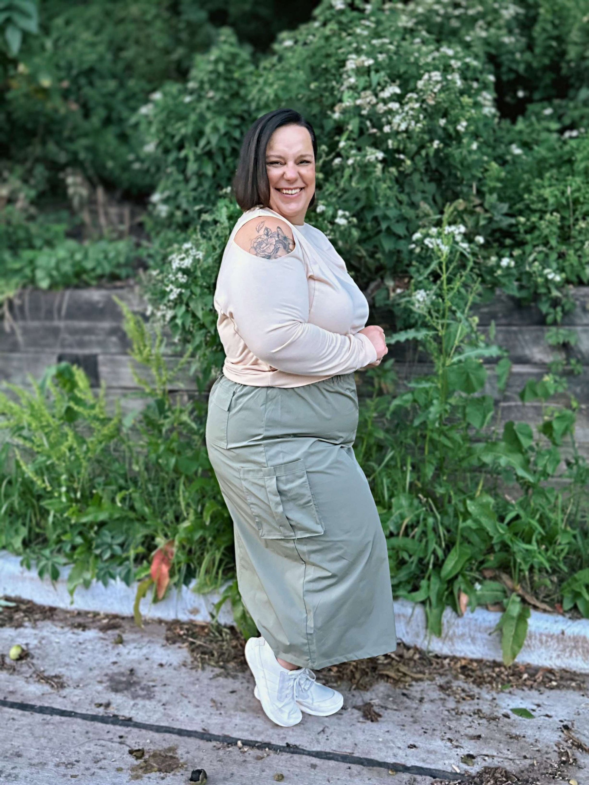 Randi is 264lbs, 5'7, 42F chest. Typically a 1x/2x on top and a 14/16W on bottom. Wearing the 2xl. She says, "This top may be a cold shoulder but she is HOTTT!!! The color and the softness together make the perfect piece to pair with all your bottoms this fall."