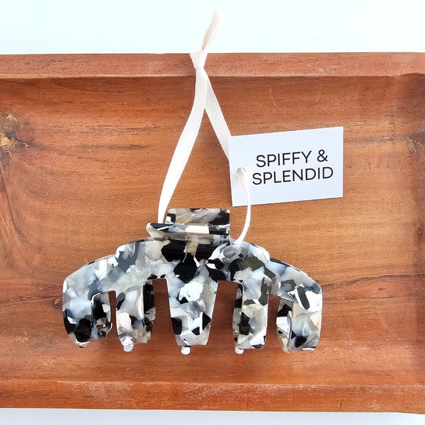 - Plant-based acetate acrylic hair claw with a clear protective cover over the spring.