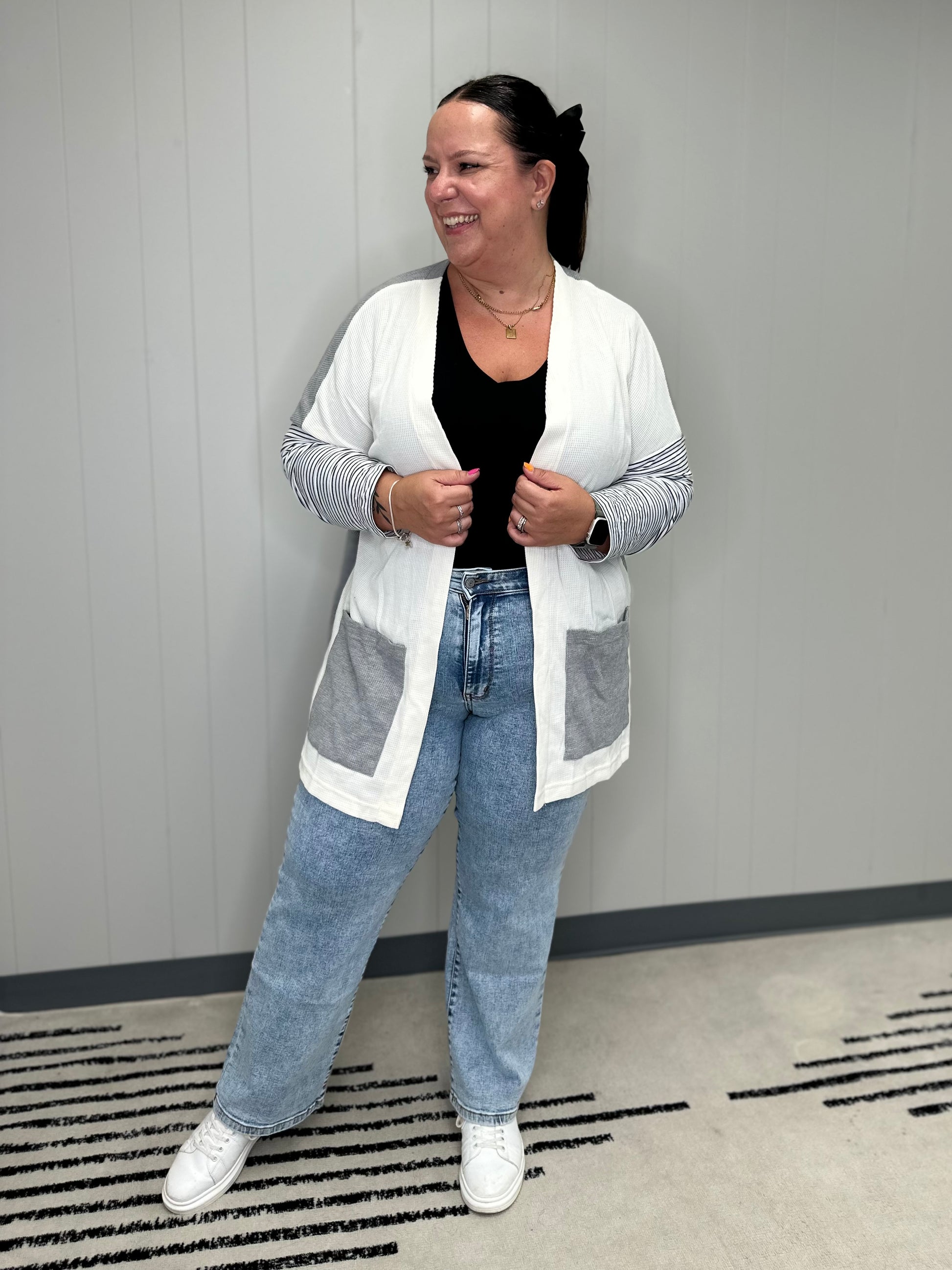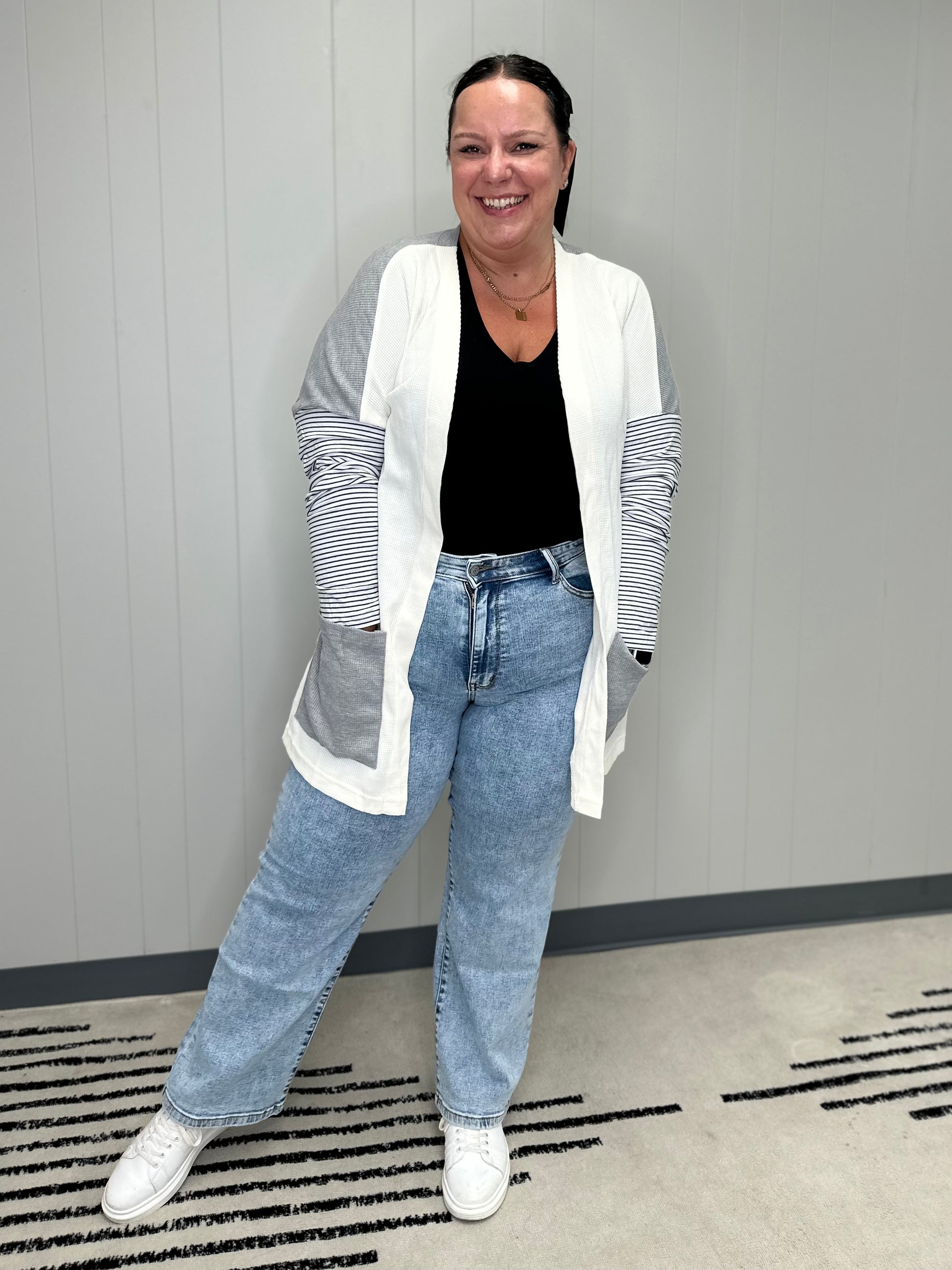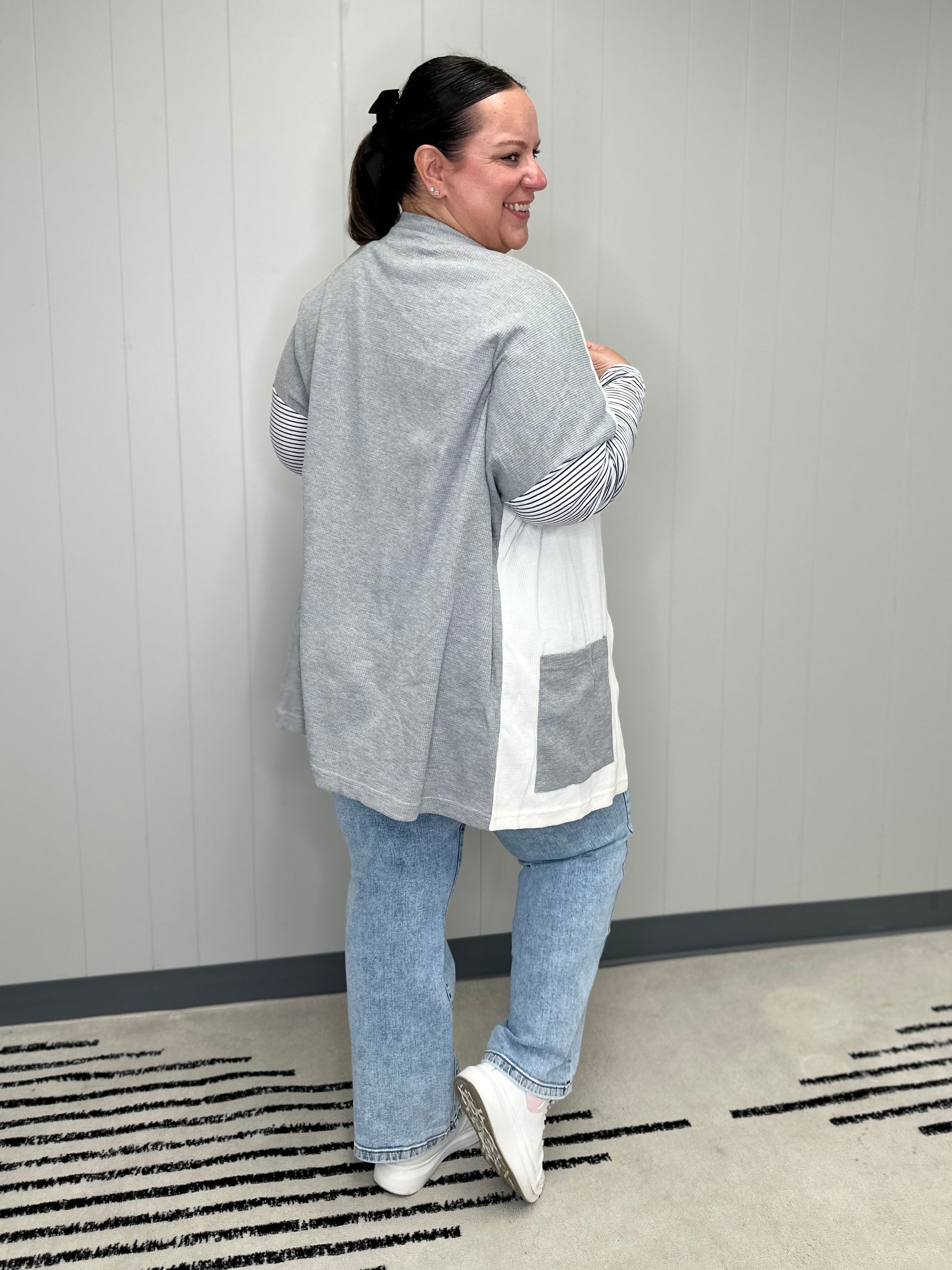 Comfy meets cool in the Consider It So Color Block Cardigan. With a soft waffle knit body and contrasting jersey knit accents, this cardigan brings a cozy, lived-in feel with a modern twist. The open-front design and relaxed drop shoulder fit make layering effortless, and the functional patch pockets keep it practical. Toss it on for a chill day at home or a casual outing—either way, it’s the kind of piece you’ll reach for again and again.