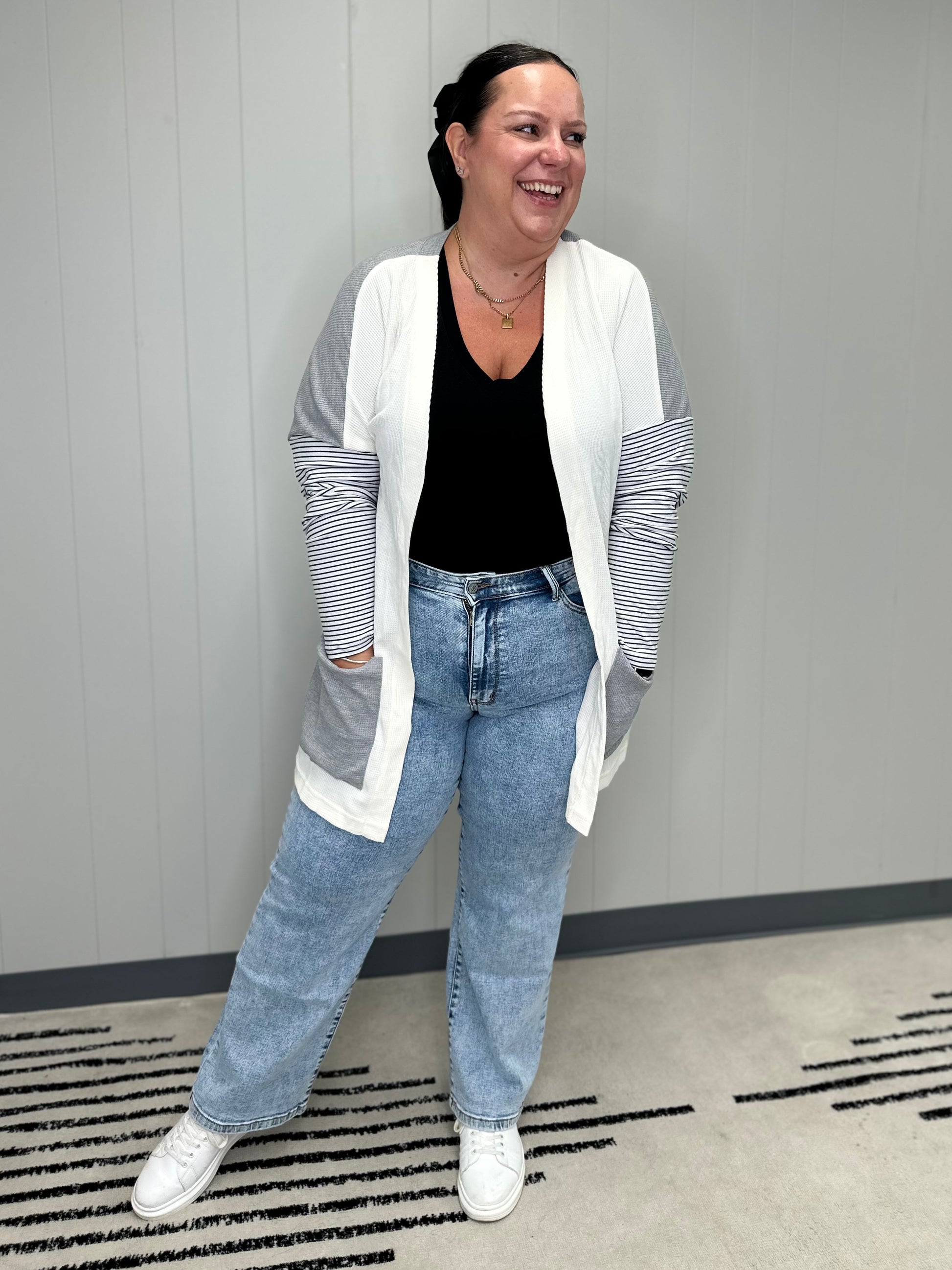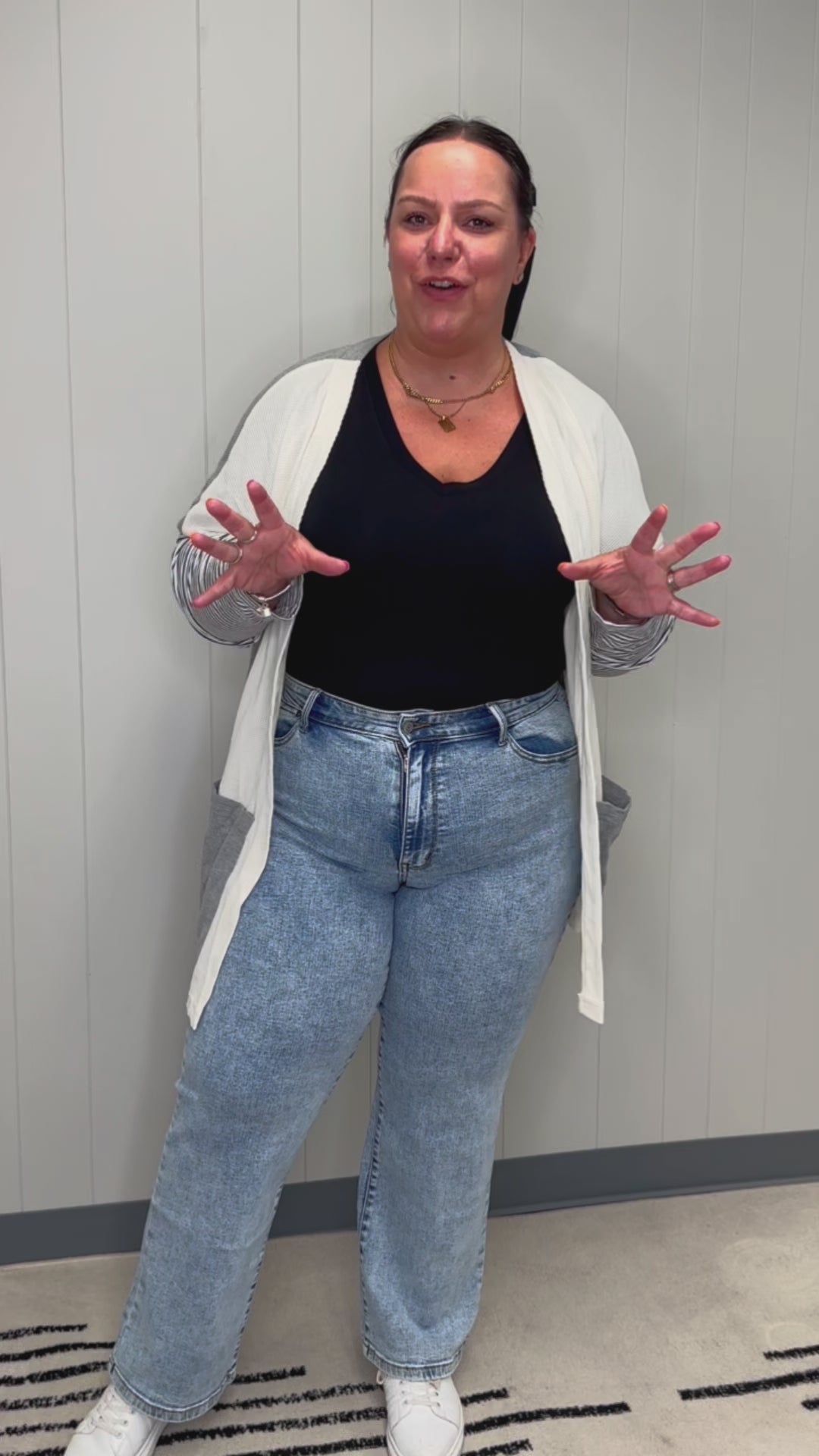 Randi is 5’7, 255lbs, 42F. Typically a 1XL on top and a 14w on bottom. Wearing the 2xl. She says, "I love the oversized feel of this without it looking “frumpy”. This is the kind of cardigan you reach for time and time again!"