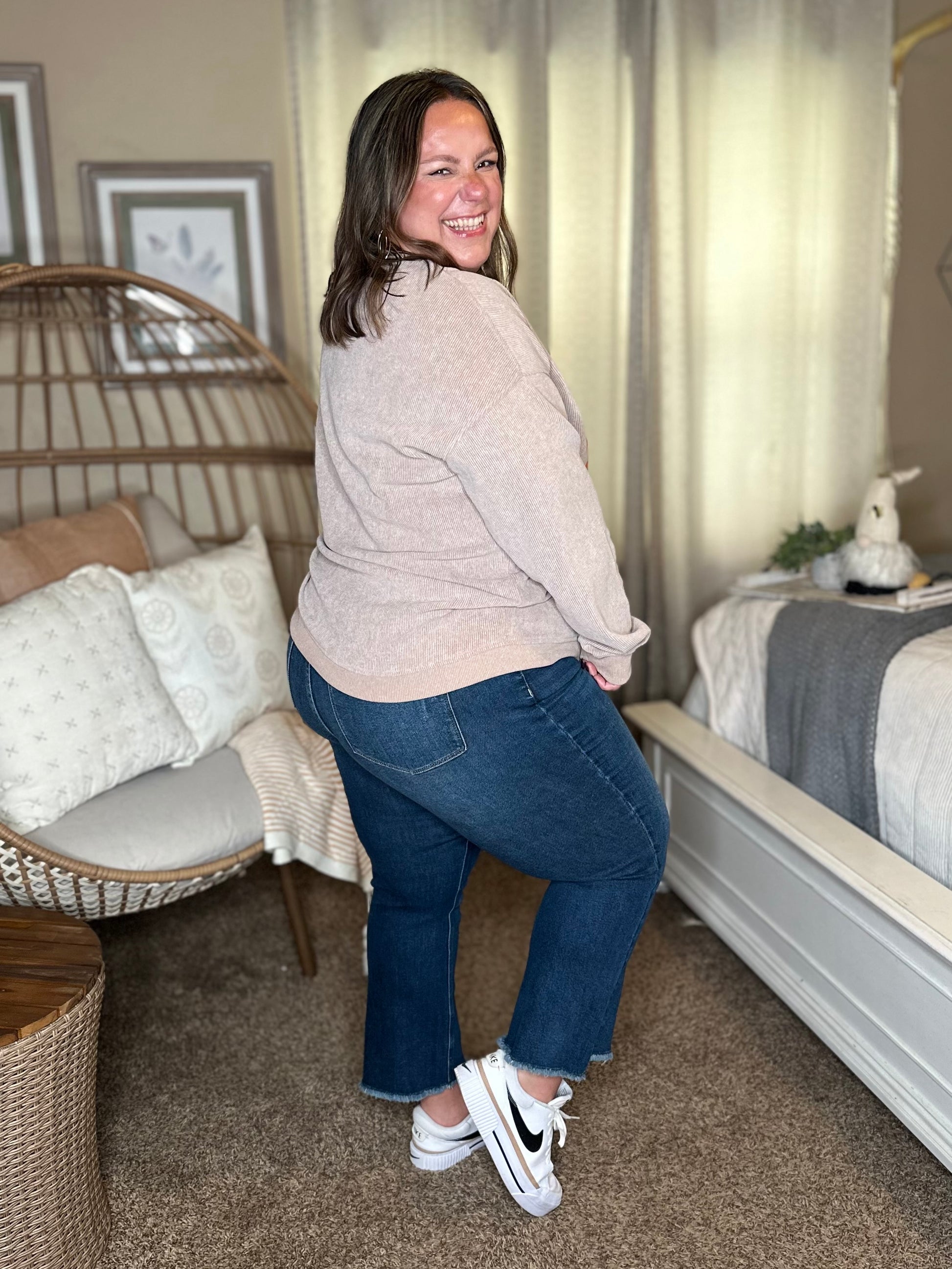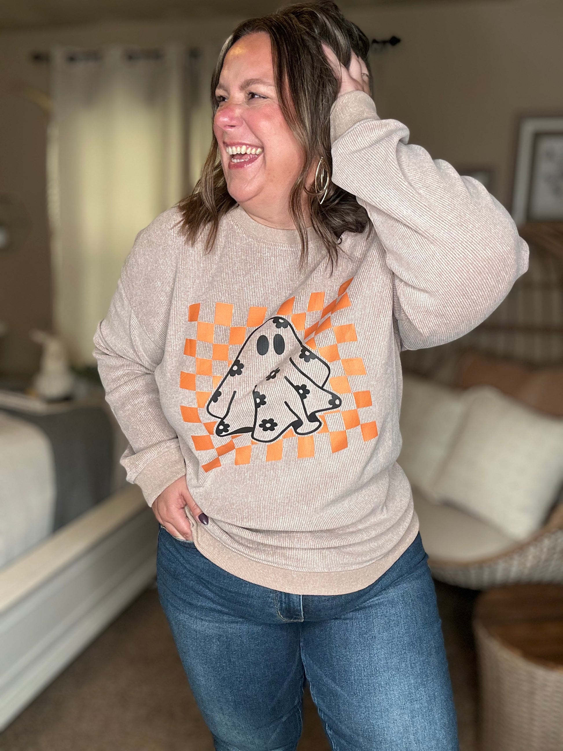 Randi is 255lbs, 5'7, 42F. Typically a 1XL on top and a 14W on bottom. Wearing an XL. She says, "I am obsessed with this sweatshirt! The checkerboard floral ghost is so unique and cute, and it’s super cozy for fall. Perfect for pumpkin patch trips or just lounging at home. I’m definitely wearing this all season!"