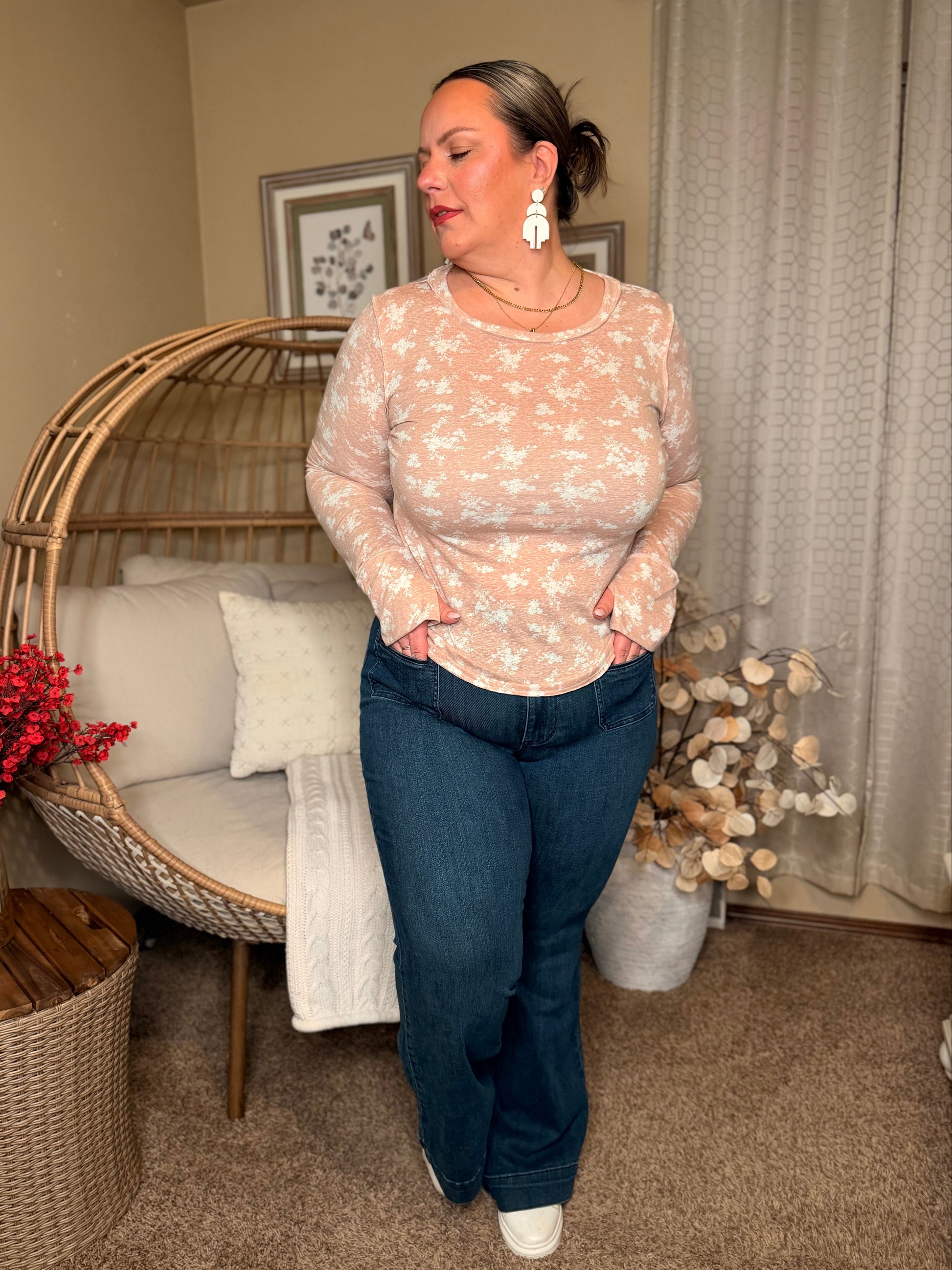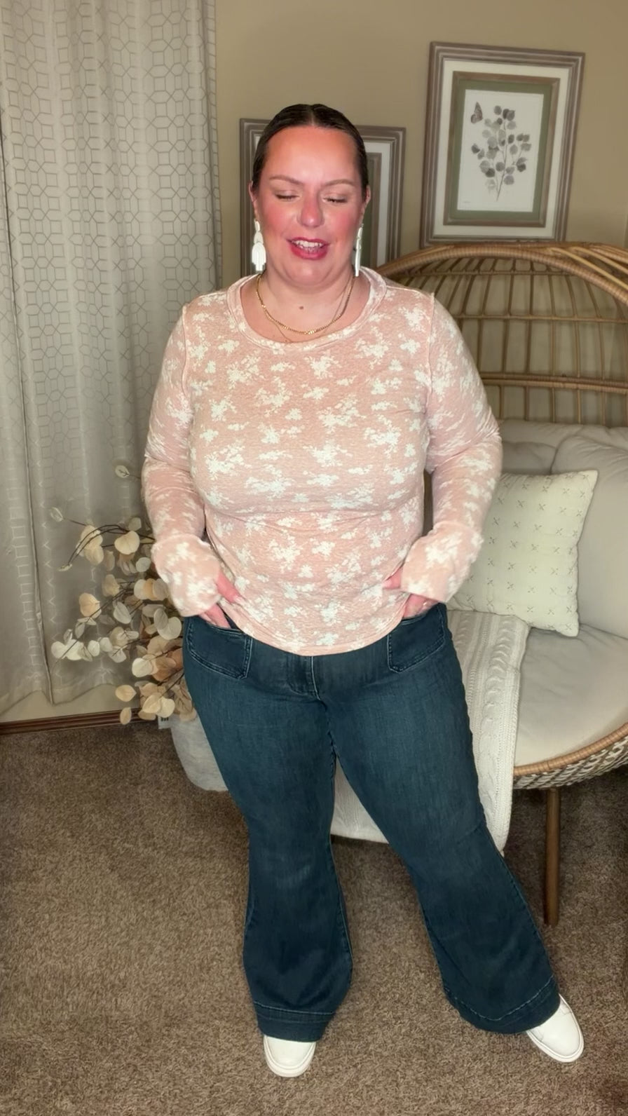 Randi is 257lbs, 5’7, 42F. Typically a 1XL on top and a 14W on bottom. Wearing a 14W. she says, “High waisted annnnd stretchy?! Say less! Finally a cute pair of flairs that isn’t 4 inches too long on is short legged girls!”