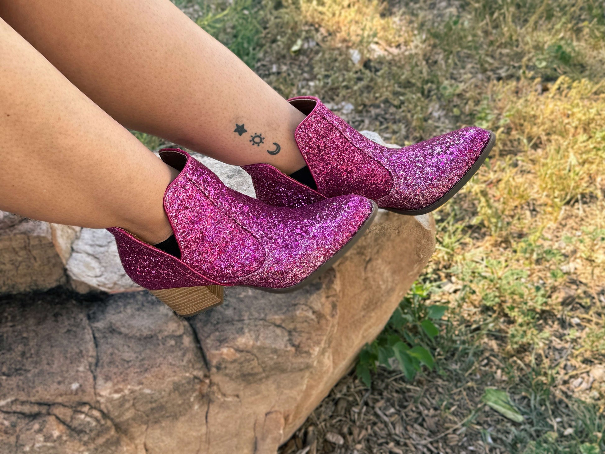 Some of our best selling booties last year were the charcoal version of these. They are back in fuschia! NOTHING quite says 'I'm here for the party' like a pair of glitter booties.