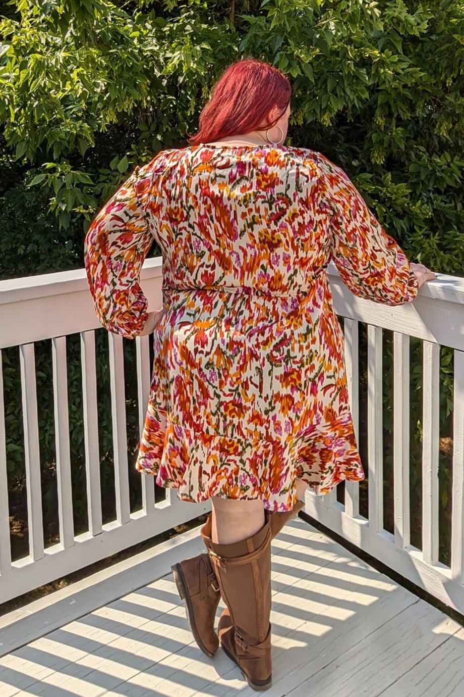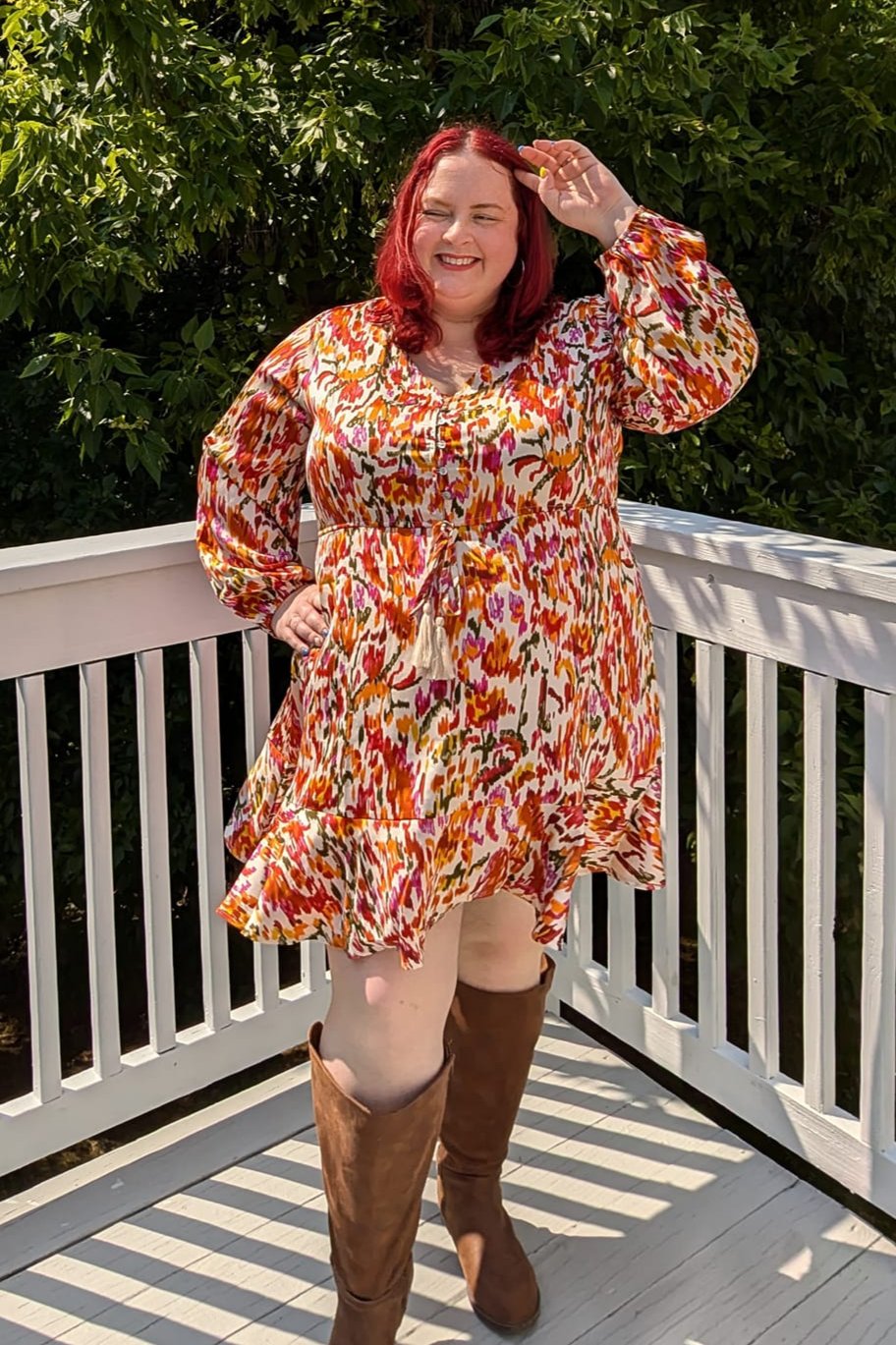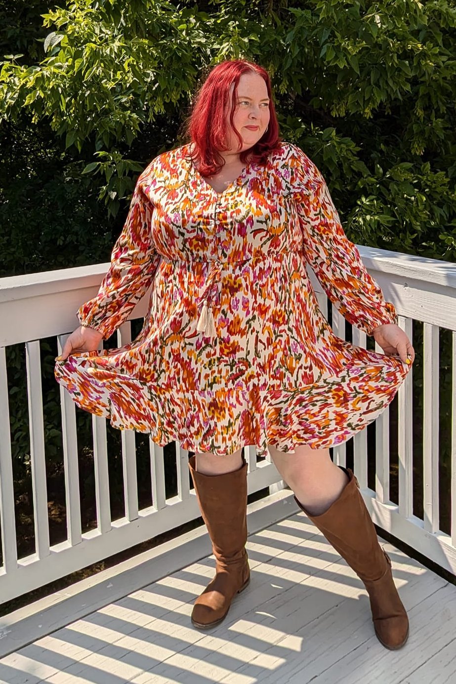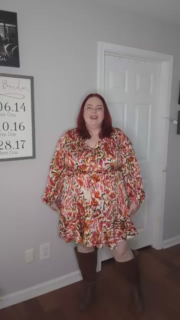 She says, "This dress SCREAMS all things fall!! The sleeves are lightweight so it isn't heavy and hot. Imthe length is perfect for transitioning from summer to fall. Boots and flats pair nicely. I love the colors so much. This dress is so gorgeous and a must."