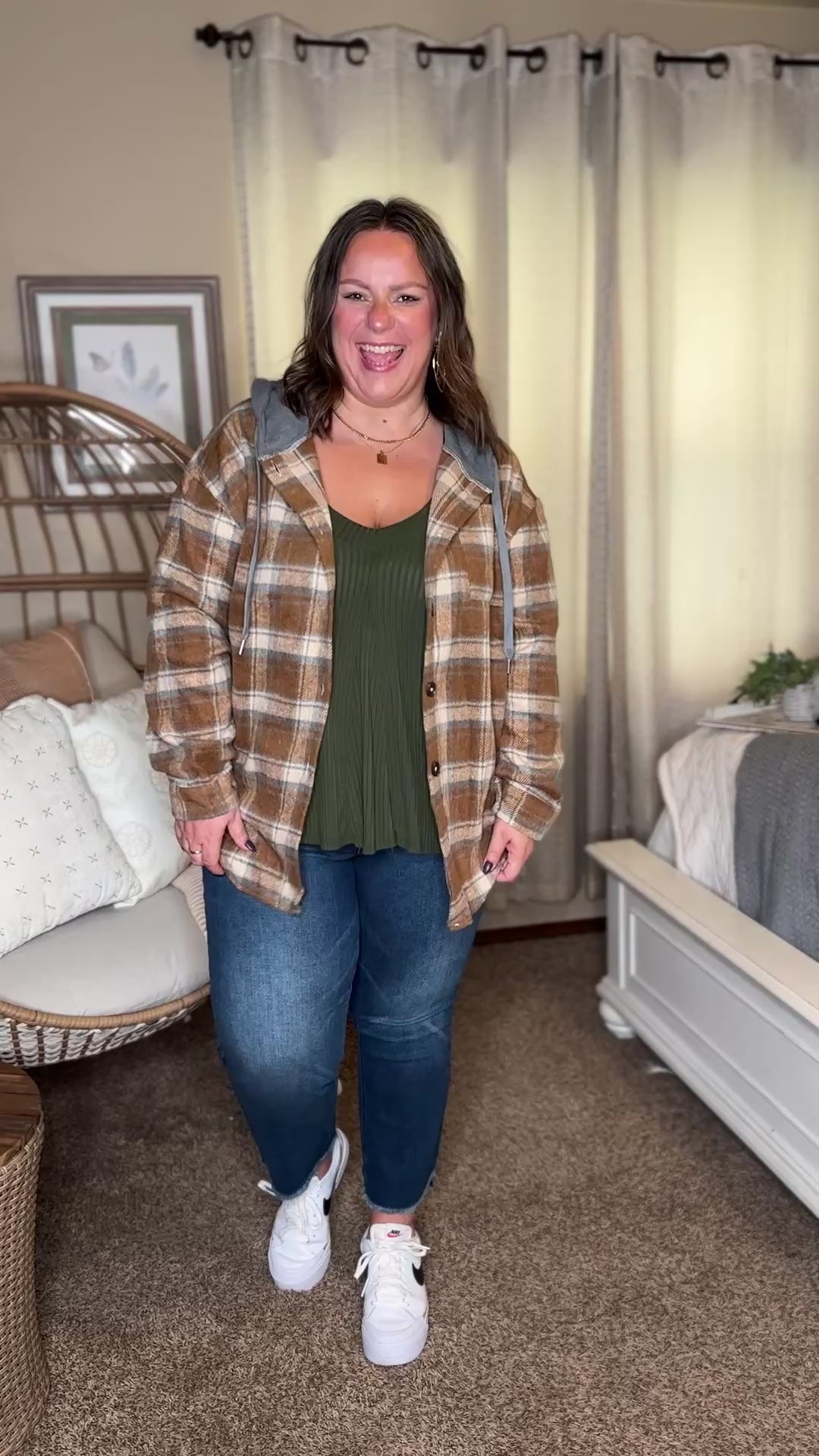 Randi is 255lbs, 5'7, 42F. Typically a 1XL on top and a 14W on bottom. Wearing an XXL. She says, “I didn’t know I needed this shacket until I put it on and now I can’t take it off! It’s lightweight but still warm and cozy, and the oversized fit is exactly what I wanted. Love the plaid, love the pockets… seriously the cutest throw-on piece for fall!” 🍁✨