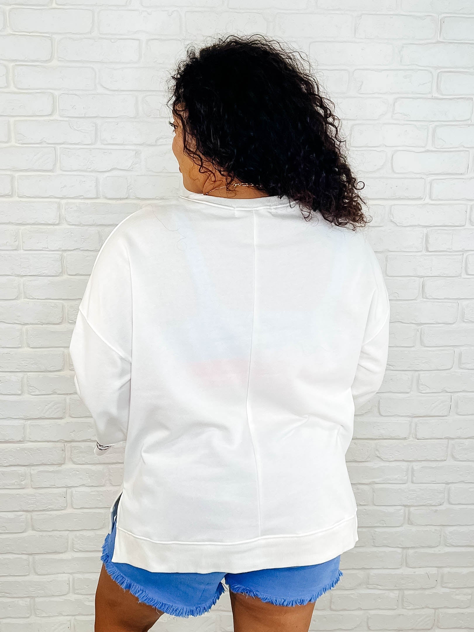 Embrace the flower power with our Peace, Love, and Flowers top! Crafted from soft French Terry fabric, this top combines comfort and style with its banded ribbed neckline, drop shoulder design, and raw sleeve cuffs. The standout stitched floral appliqué peace sign brings a playful and groovy touch. Perfect for a laid-back vibe, this top is all about good vibes and fun fashion!