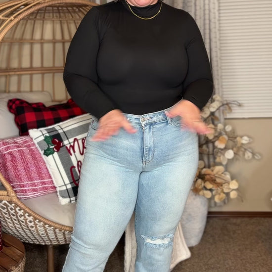 Our Simple Situation Mock Neck Bodysuit is the perfect combination of style and comfort. Enjoy a cozy, buttery soft fabric, featuring a mock neckline and long sleeves. The thong style ensures a seamless fit and look. Look great and feel amazing with this unique and comfortable bodysuit.