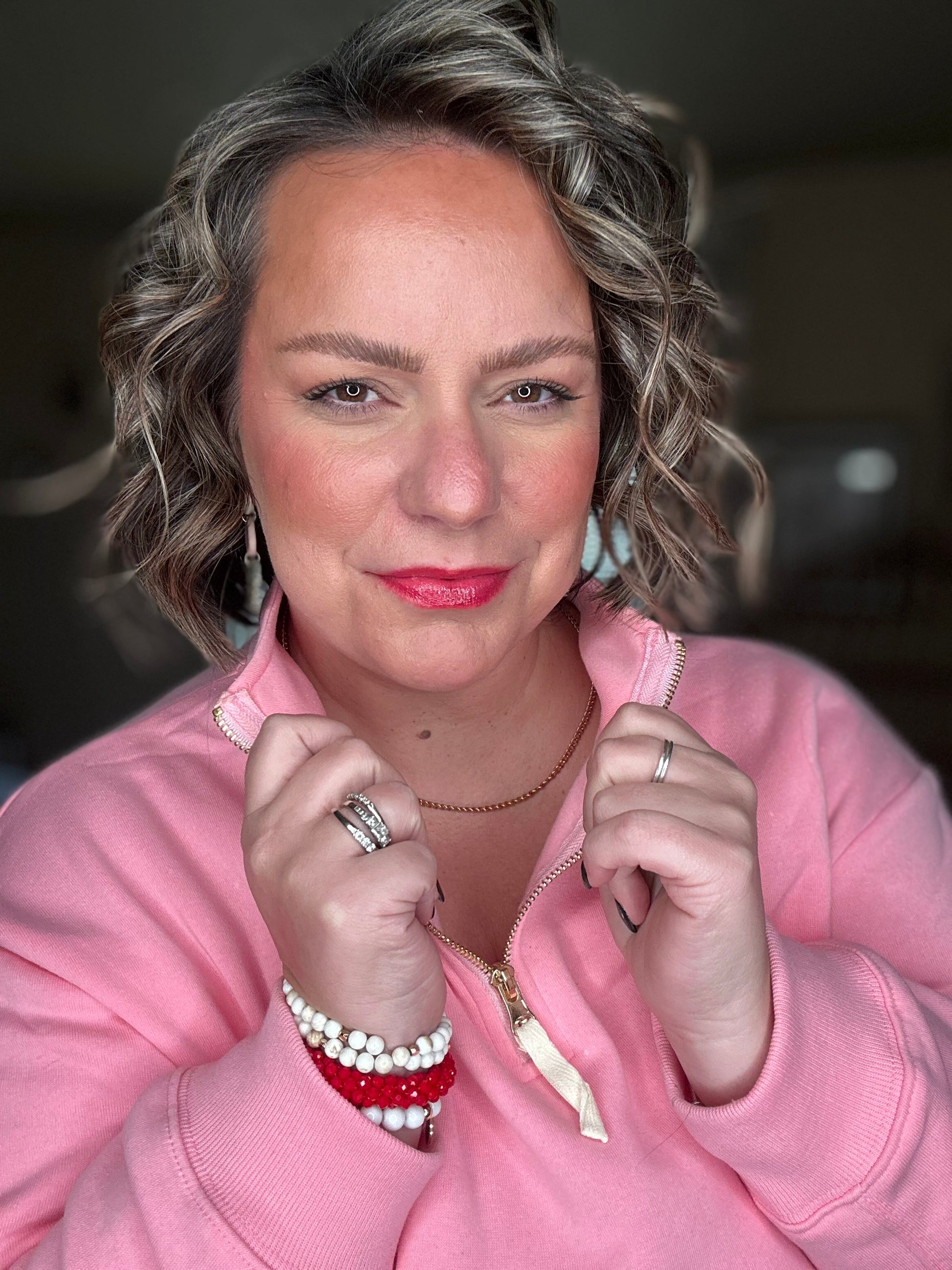Randi is wearing the dark pink and is 255, 5’7, 42F. Typically a 1XL on top and 14w on bottom. Wearing a 1XL. She says, “It’s soft. Perfect temp. Perfect length and the color is chefs kiss!”