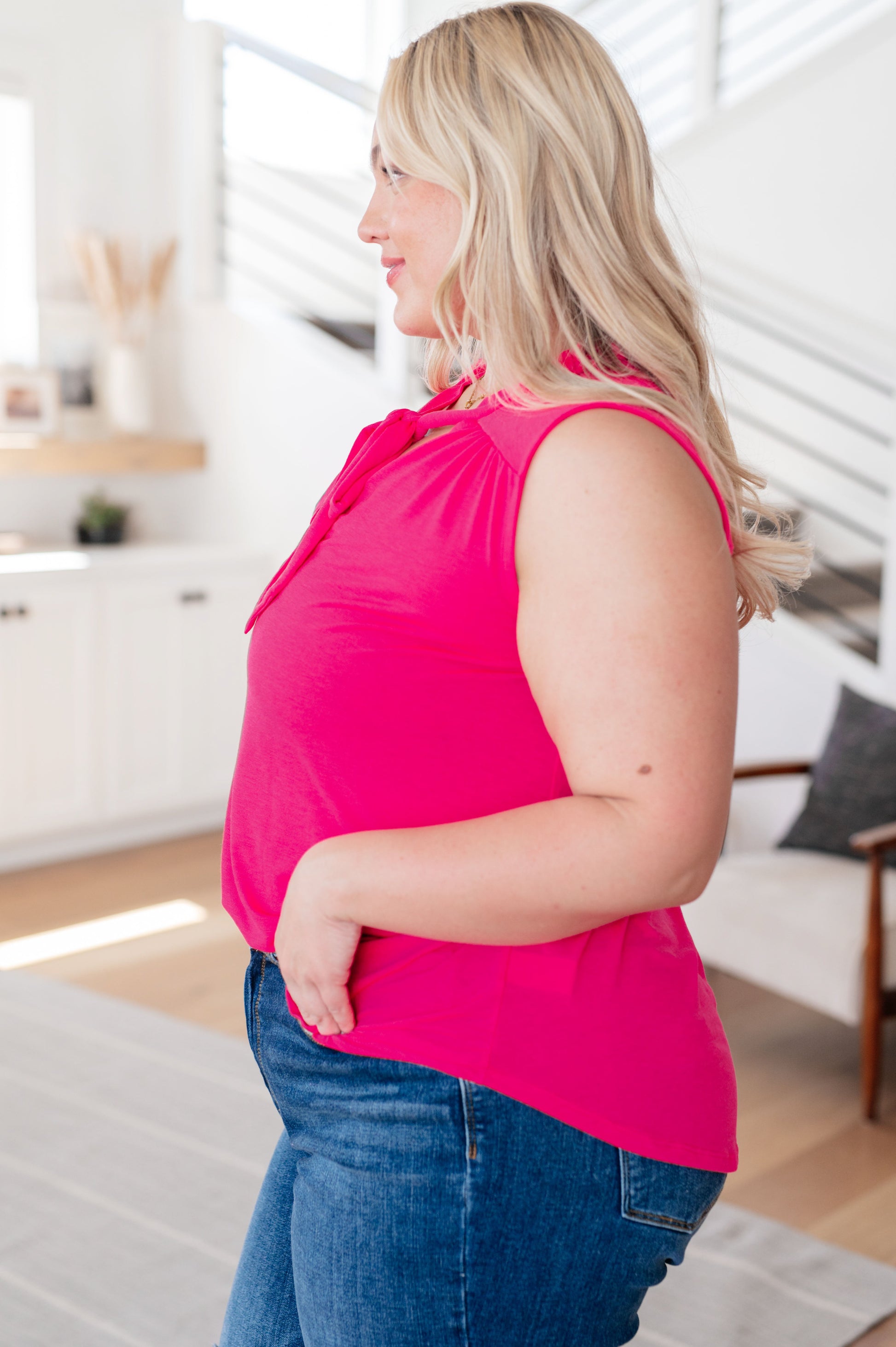 Turn heads in this Uptown Girl Sleeveless Blouse. With a sophisticated V-neck and functional front tie, this blouse exudes elegance. The scooped high low hem adds a touch of playfulness, while gathered details provide a flattering fit. Made with Bulgari fabric, this top is the perfect blend of luxury and style. (Sorry, not included: an actual uptown girl.)